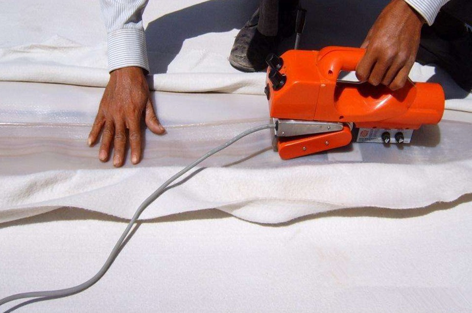 底部土工膜應盡快與邊坡上土工膜連接上,防止下雨時,雨水倒灌進入土工膜焊接成品的下面。底部土工膜的鋪焊是在邊坡土工膜鋪焊完成之后進行的。按裁好的土工膜尺寸,一幅一幅鋪設,做好記錄。在鋪設土工膜時,應邊鋪邊焊,當天鋪設當天焊完。
